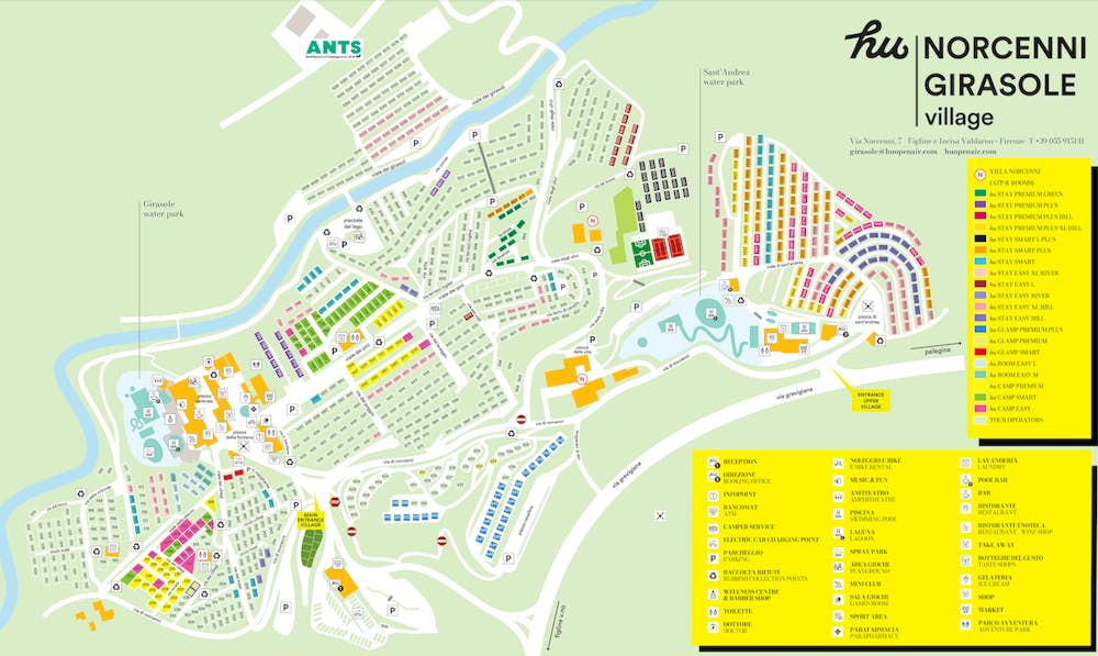 hu Norcenni Girasole village può ospitare fino a circa 3.200 persone in case mobili, bungalow, casette in muratura, camere e appartamenti in stile toscano, piazzole ad uso tenda, camper e roulotte.